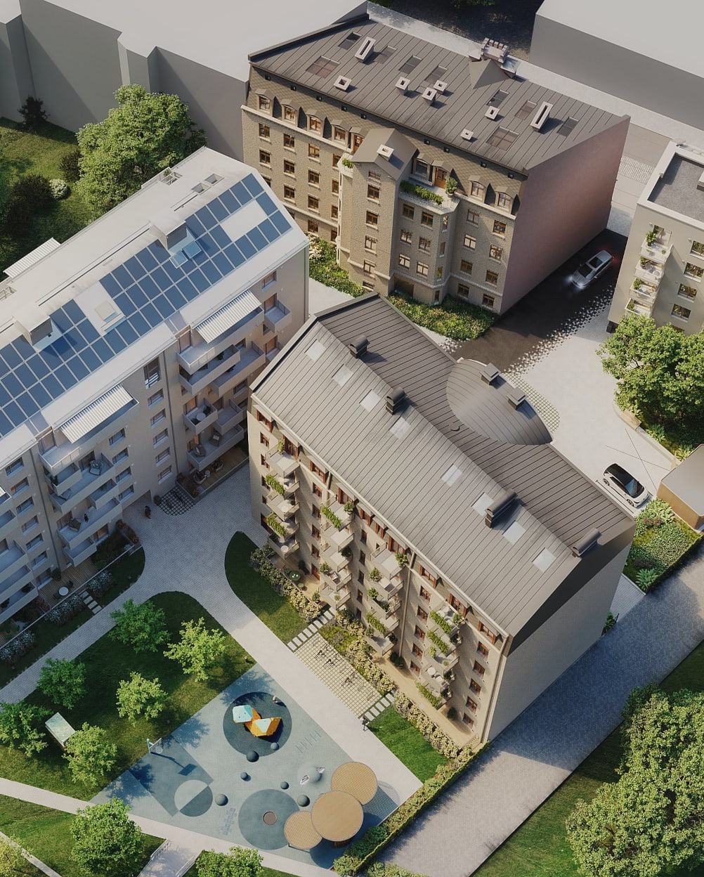 Četros namos 105 dzīvokļi dažādām gaumēm – katrs varena stāsta cienīgs. Vēsturiskajās ēkās pieejami jauni, mūsdienu komforta prasībām atbilstoši dzīvokļi klasiskās noskaņās, augstiem griestiem un parketa grīdām. Jaunbūvēs dzīvokļu moderno estētiku iespējams papildināt ar parketa vai kvarcvinila grīdas segumu.